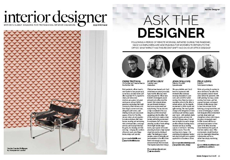 In Interior Designer magazine’s Ask the Designer feature, our Director and Founder John Williams reflects on the lasting impact of the pandemic on workplace expectations. While hybrid working may be the headline, John suggests the real long-term change is the growing priority placed on employees’ mental and physical health, alongside a renewed appreciation of business culture. As he shares in the feature,